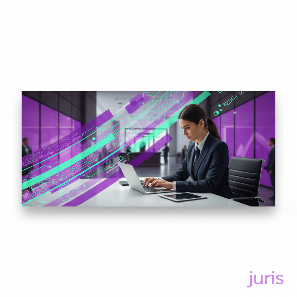 Advogada correspondente usando notebook e smartphone para gerenciar diligências em Paim Filho, ambiente moderno com tons de roxo e verde-água